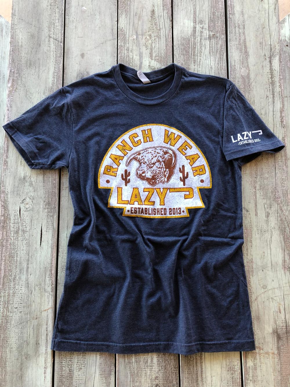 Lazy J Ranch Wear Navy Arrowhead logo Short Sleeve T-Shirt. Cotton blend. Unisex. Lazy J brand on sleeve. Runs a little small. Please size up for a looser fit.