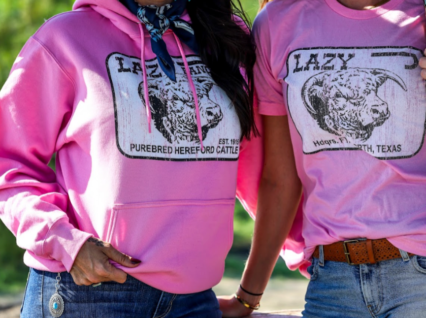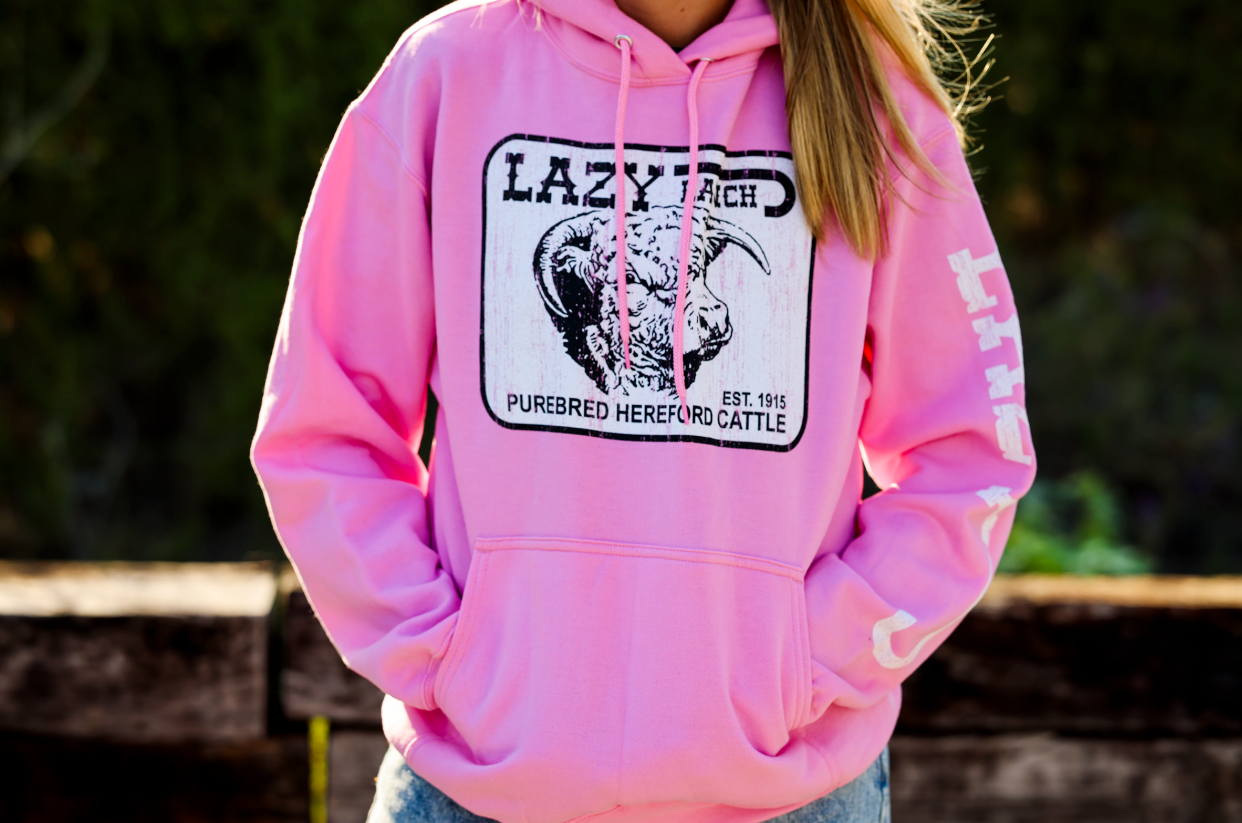 Cozy sweats in core weight fleece. Drawstring hood, long sleeves, kangaroo pocket. White Purebred Hereford Graphic on front chest and logo on left sleeve. Hooded sweatshirt in pink color.