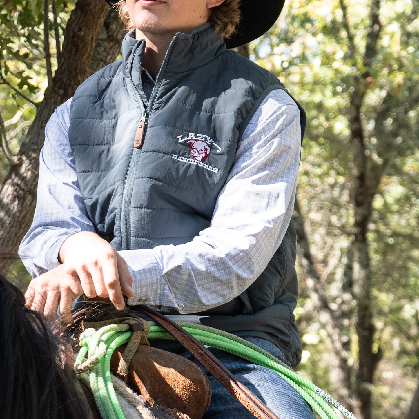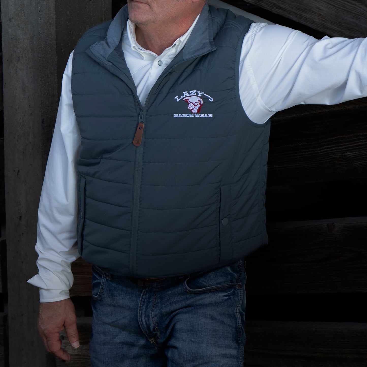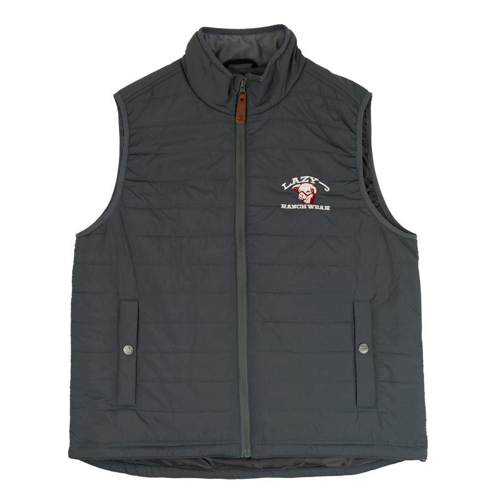Upgrade your Western wardrobe with the Lazy J Ranch Men's Poly Fill Vest - Muted Blue, a perfect blend of style, warmth, and durability. Designed for outdoor enthusiasts, ranchers, and casual wearers alike, this quilted vest features lightweight insulation, a full-zip front with a leather pull tab, and the signature Lazy J Ranch Wear embroidered logo. Its rich muted blue color adds a rugged yet refined look, making it ideal for layering in cool weather, working on the ranch, tailgating, or casual everyday wear.